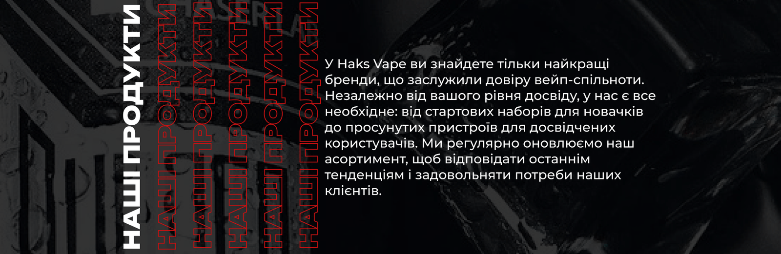 Ласкаво просимо до Haks Vape — місця, де ваші бажання щодо вейпінгу стають реальністю! Наш вейп-шоп пропонує найкращий вибір електронних сигарет, рідин та аксесуарів від провідних виробників. Ми прагнемо забезпечити вас якісними продуктами та сервісом, щоб ви могли насолоджуватися кожним моментом вейпінгу.